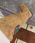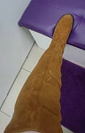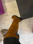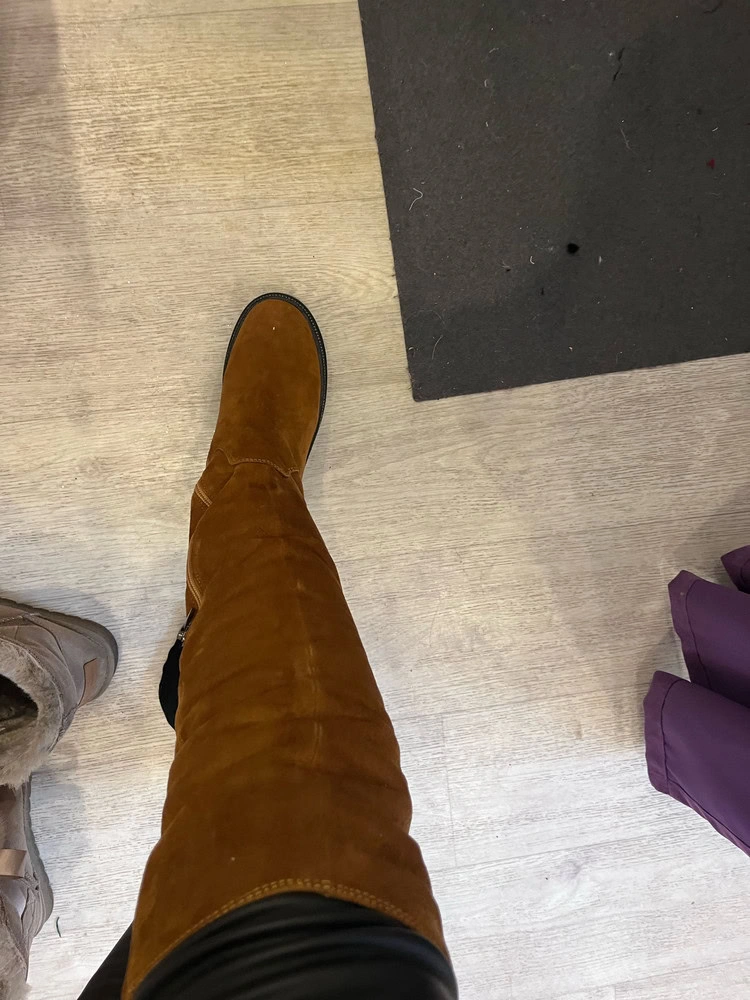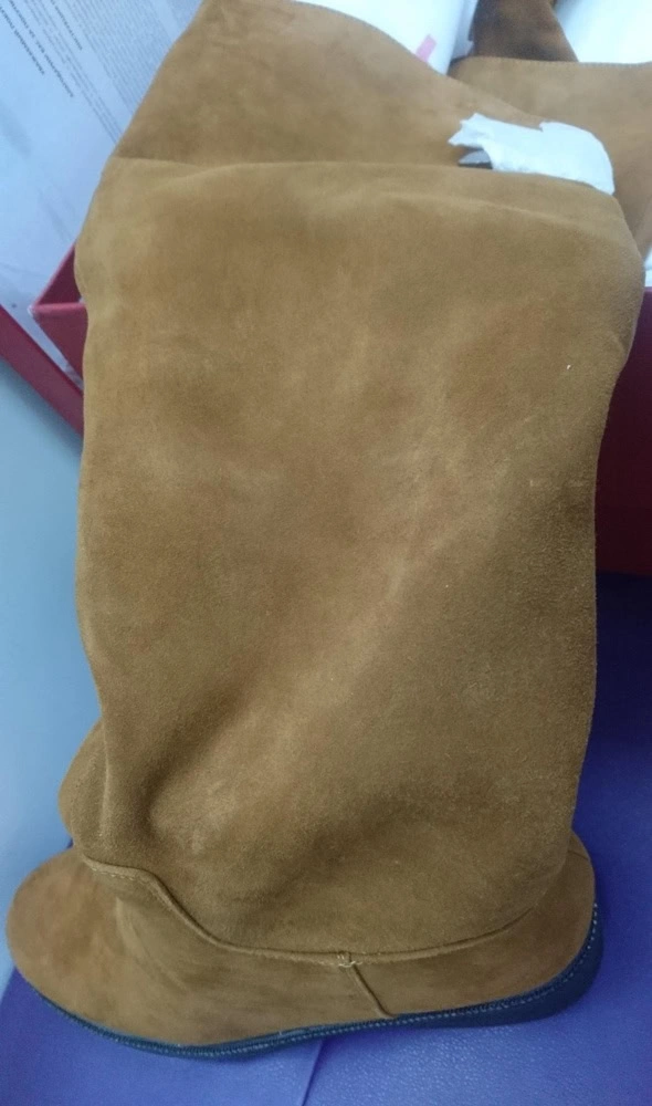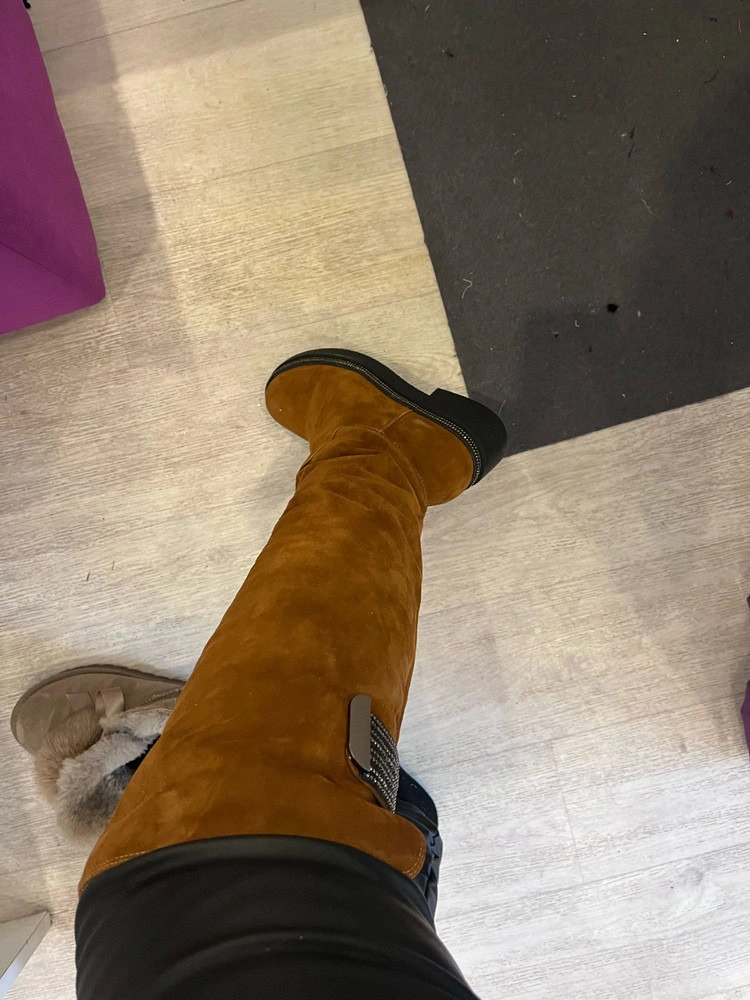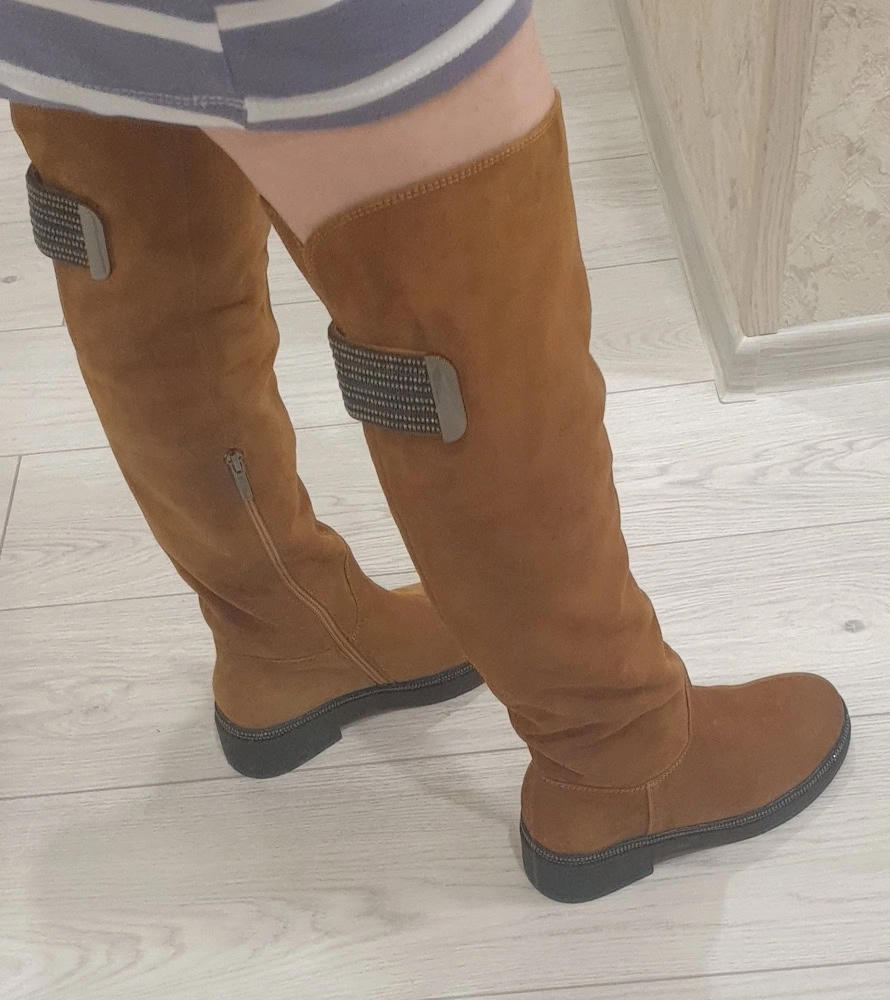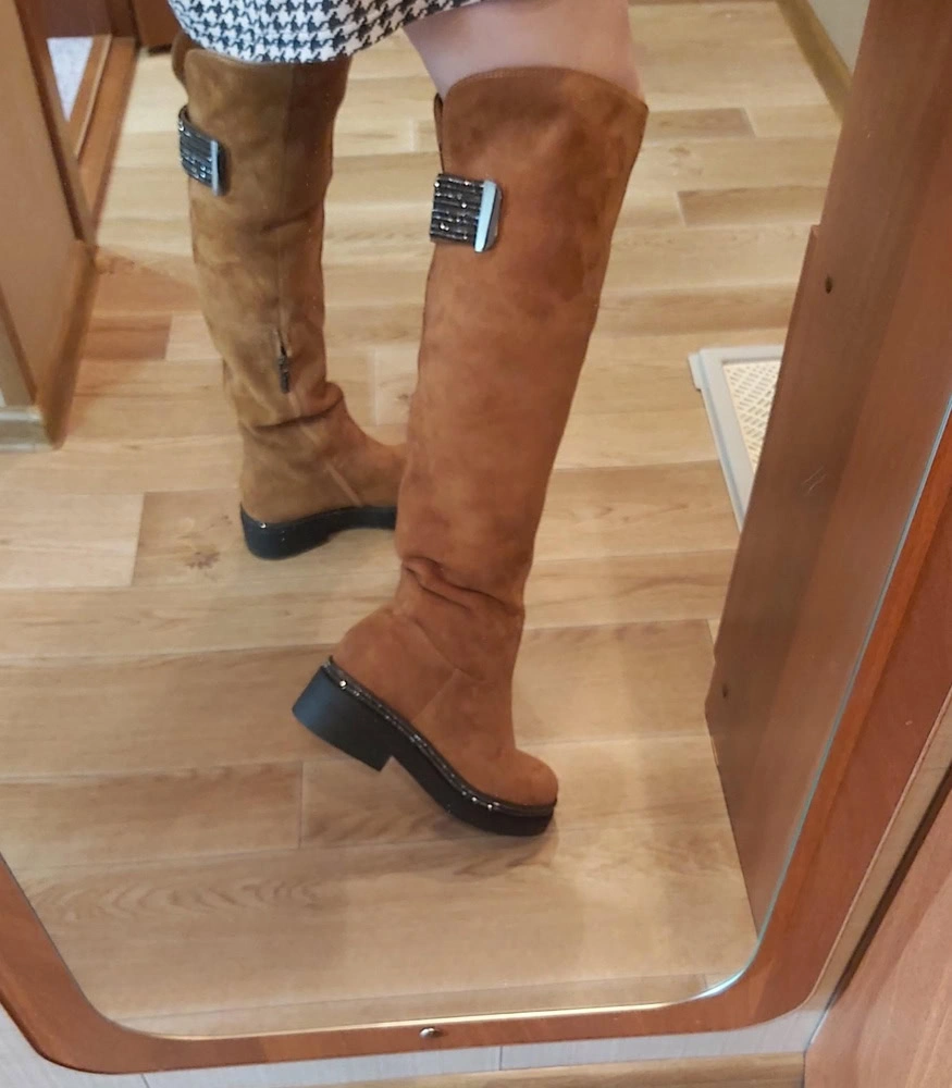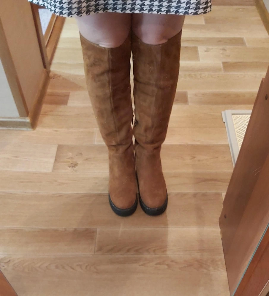 Сапоги НЕ маломерят, чётко в размер согласно таблице!!!! На узкую стопу без подъёма в аккурат 39 й размер. Если нога широкая, берите на размер больше. Мех не заросли конечно, жидковат, но подошва мощная, будет тепло. Замша хорошая. Из минусов - это цвет. Обычный светло коричневый, как на моём первом фото - типа цвета детской неожиданности, ближе к коньячному. Пачкаться будет только в путь. Два других фото со вспышкой - там цвет тона на два ярче, чем в реальности. Так ждала ботфоты. Разочарованна.