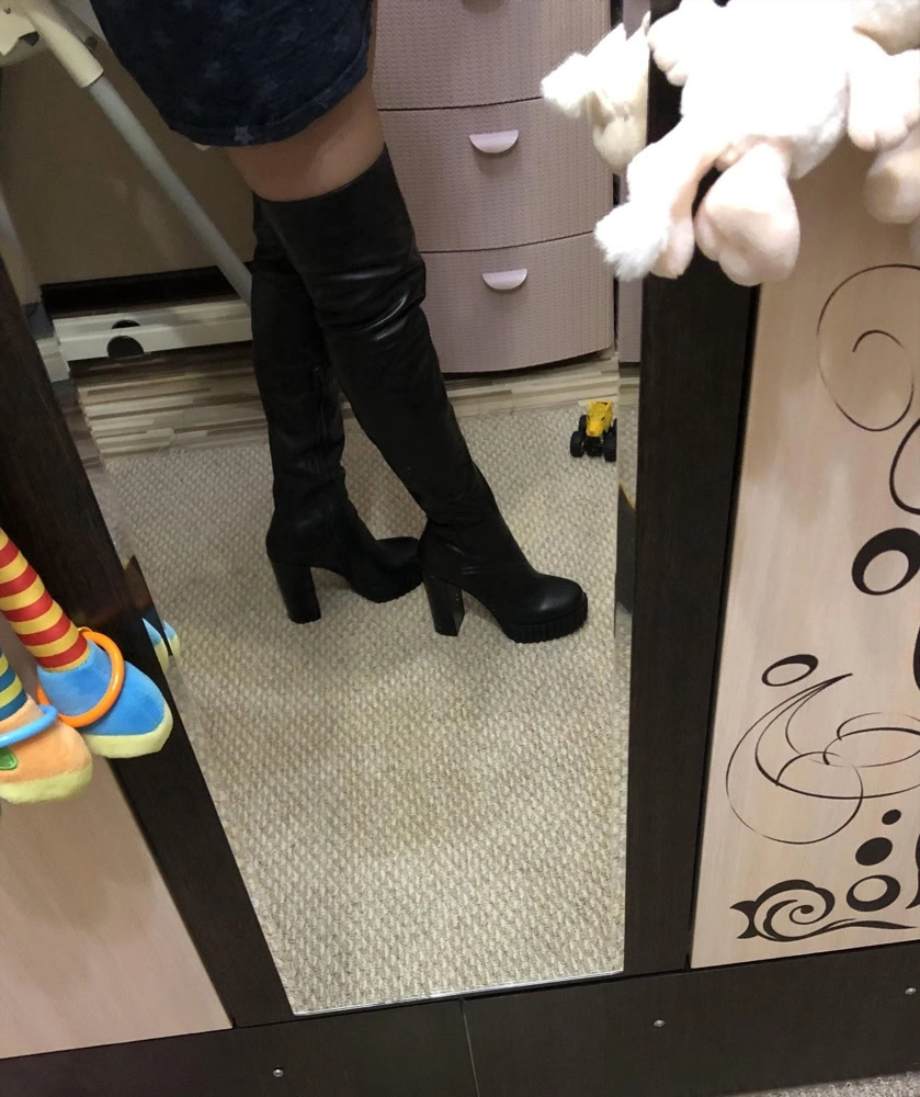 На мой 38 подошел 39 за счёт подъёма сократился размер хоть и высокий каблук и платформа но очень удобная колодка очень стильные и качественные ботфорты немного дороговато но я не могла их не взять в них я себя чувствую звездой