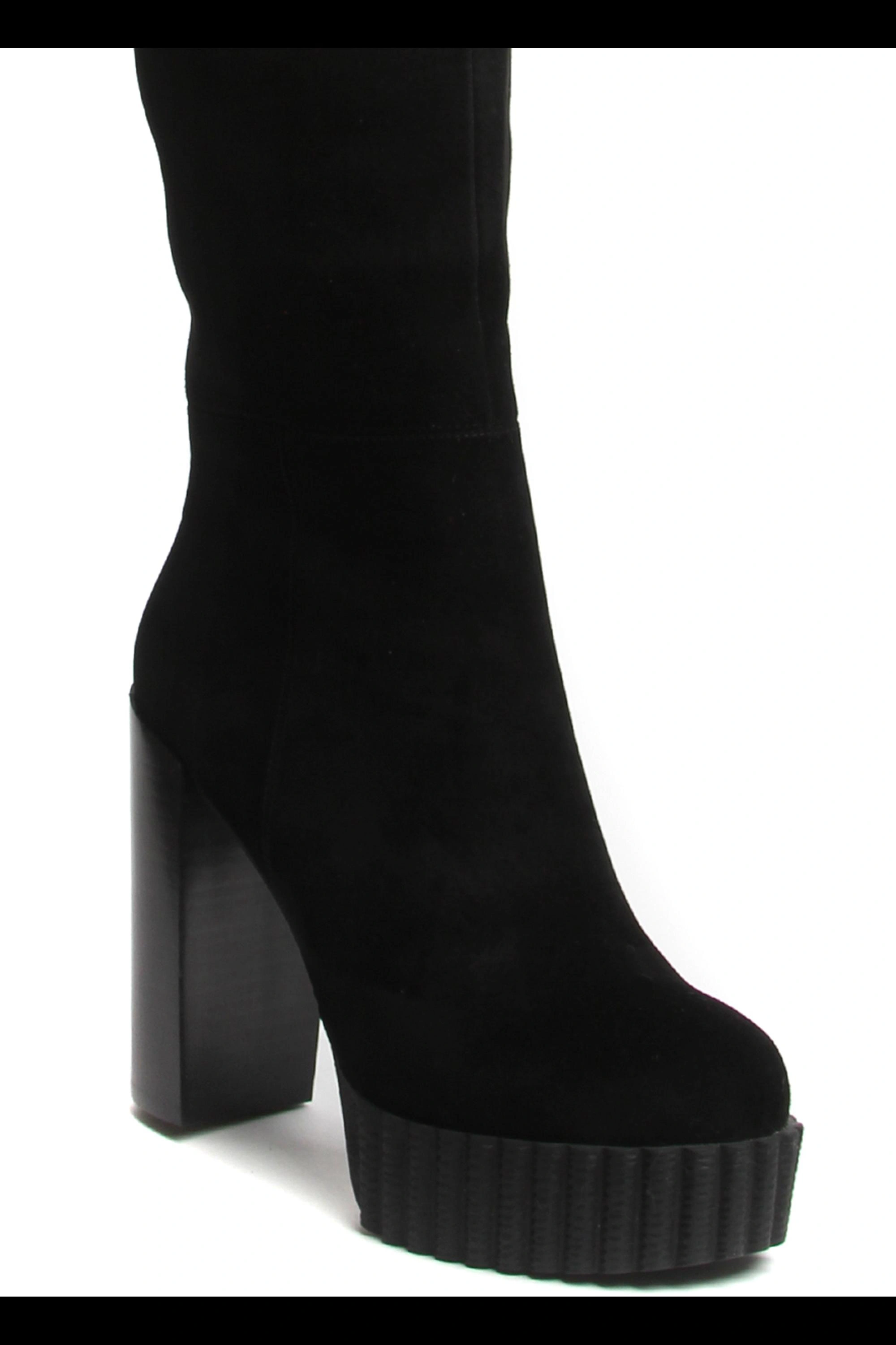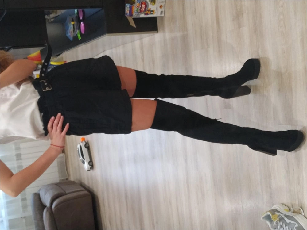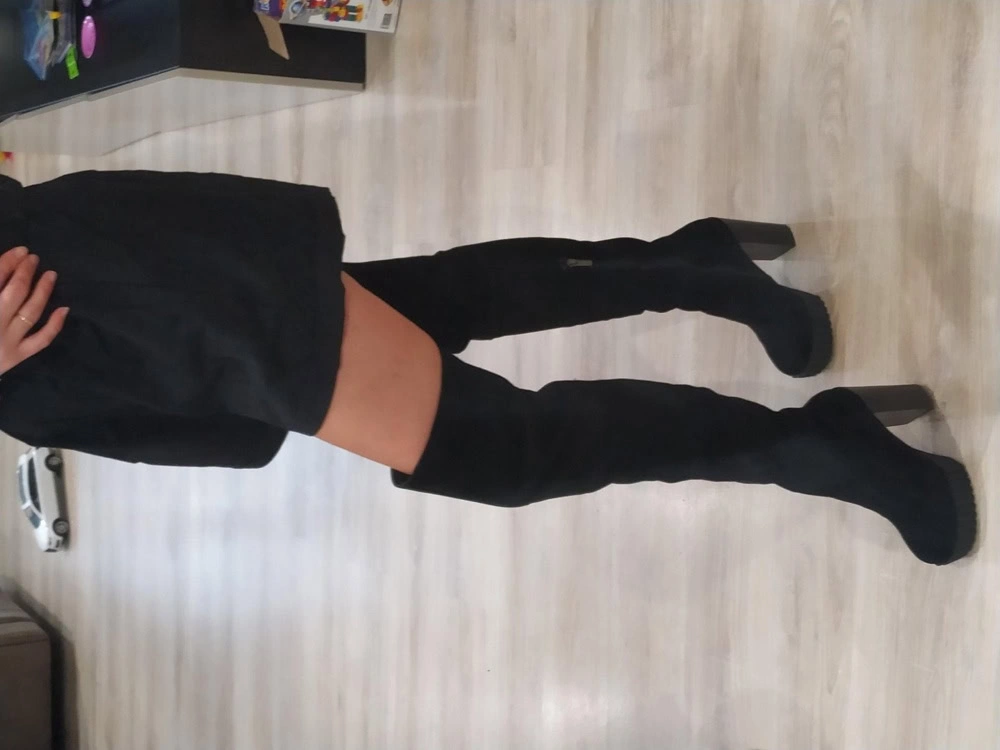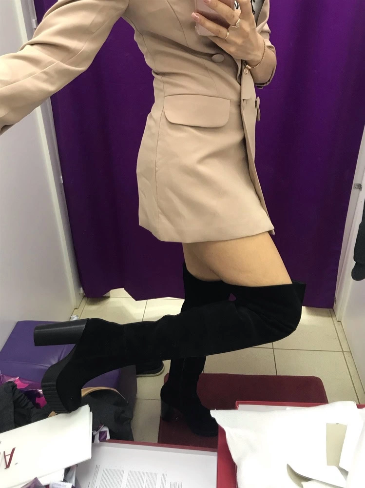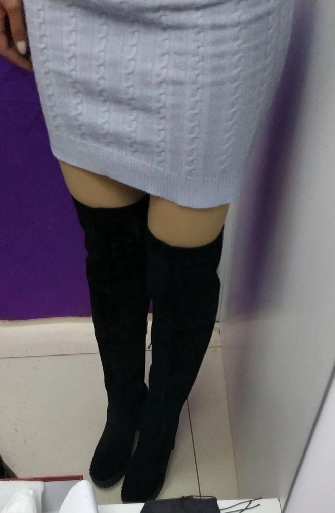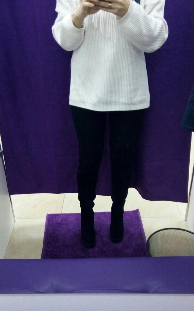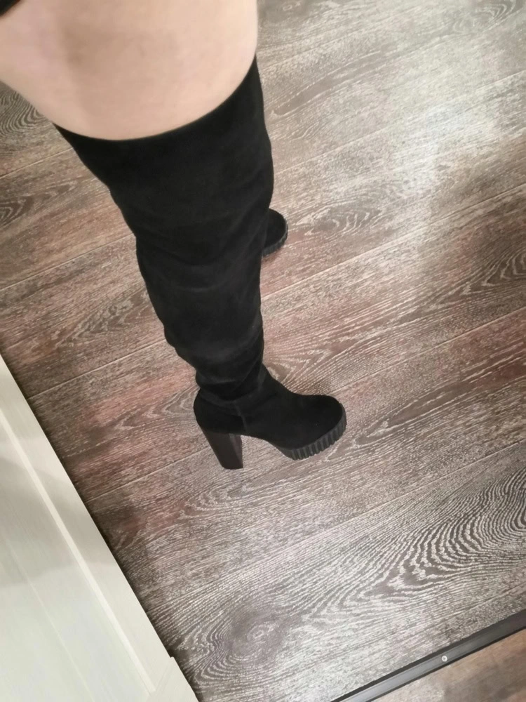 Сапожки очень понравились. Идут размер в размер. На 37 размер заказывала 37 размер. Все подошло. На рост 165 практически до середины бедра. Очень удобные и платформа и каблук. Хорошая мягкая натуральная замша. Но, обращаю внимание, идут только на стройную ногу. А то отзывы видела, что не удобно сидеть,
