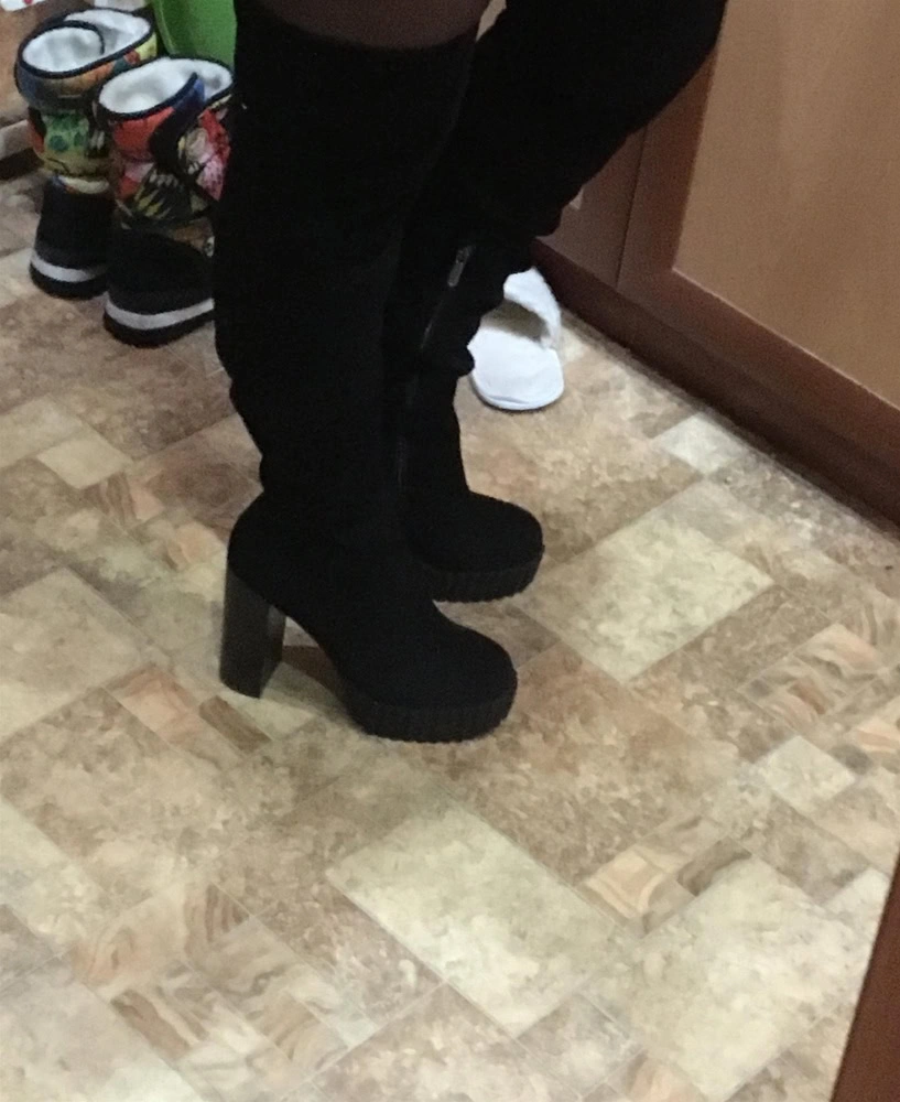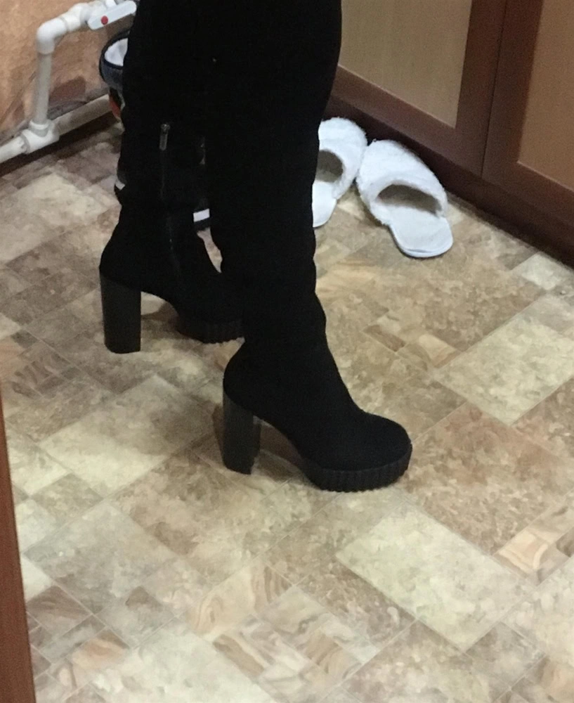 Сапоги точно по размеру, выглядят очень неплохо, НО,- каблук подбит твердой скользкой пластмассой. И , хотелось бы , чтобы в сапогах не только стоять было удобно , но еще и сидеть))),- резинка в районе сгиба ноги не выполняет свою функцию.
