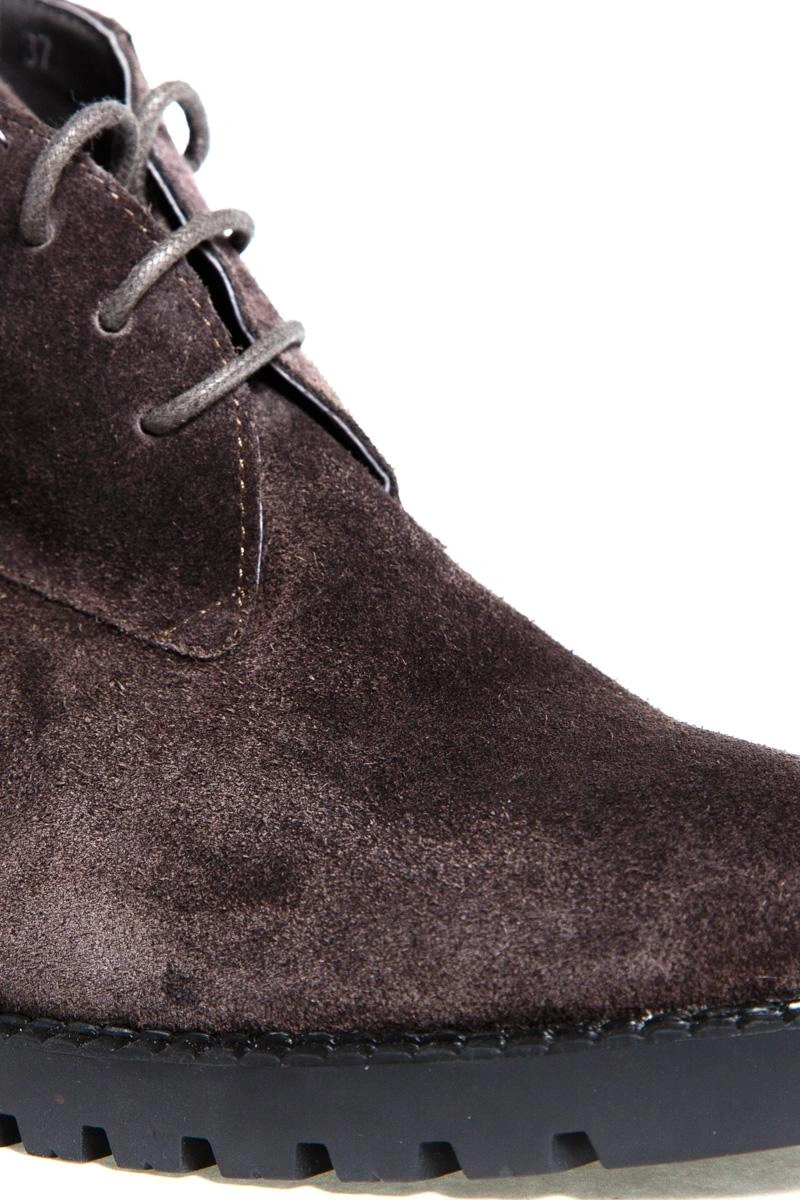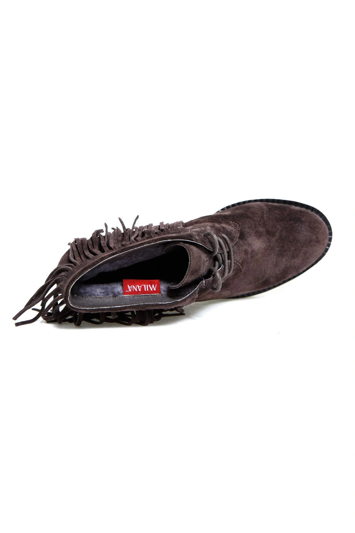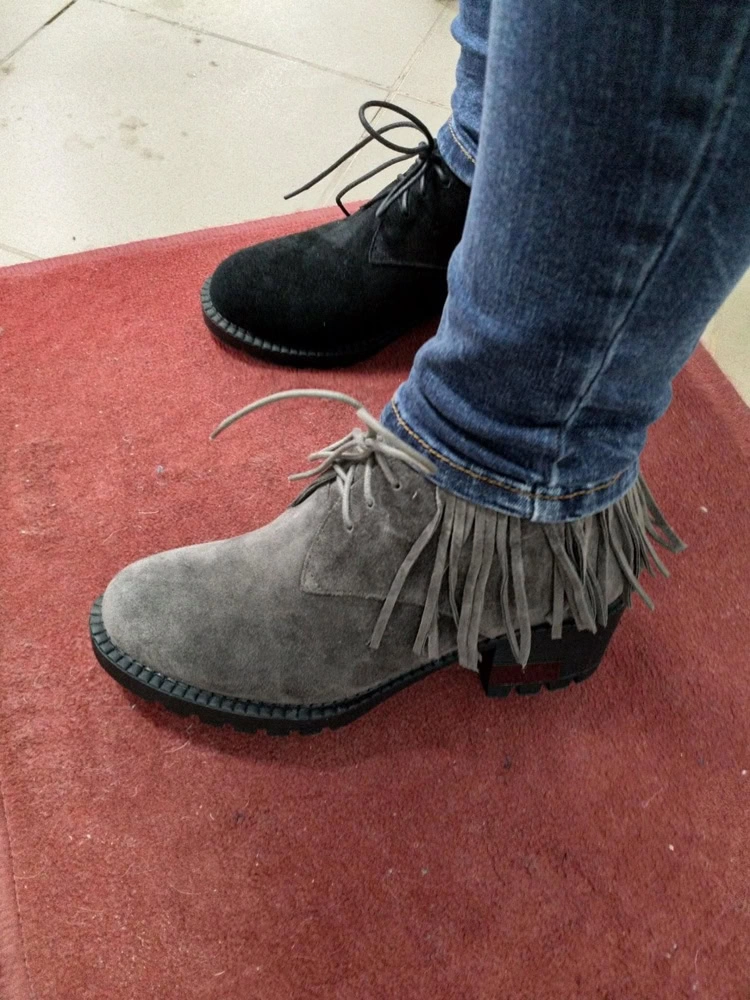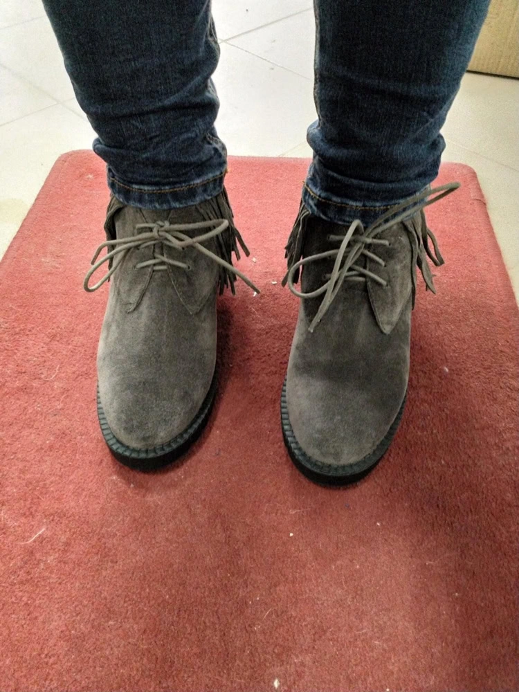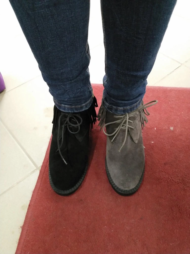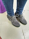 Увидела их и сразу поняла мои))) Брала на примерку черные 39 размера и серые 38. Замша натуральная, мех натуральный и не сильно тонкий. Ботинки не коричневые, а "мышиного" серого цвета, на мой взгляд, более оригинальнее смотрятся в отличие от черных. Идут в размер, на мой 38 хорошо подошёл 38 размер. Подошва абсолютно не скользкая.