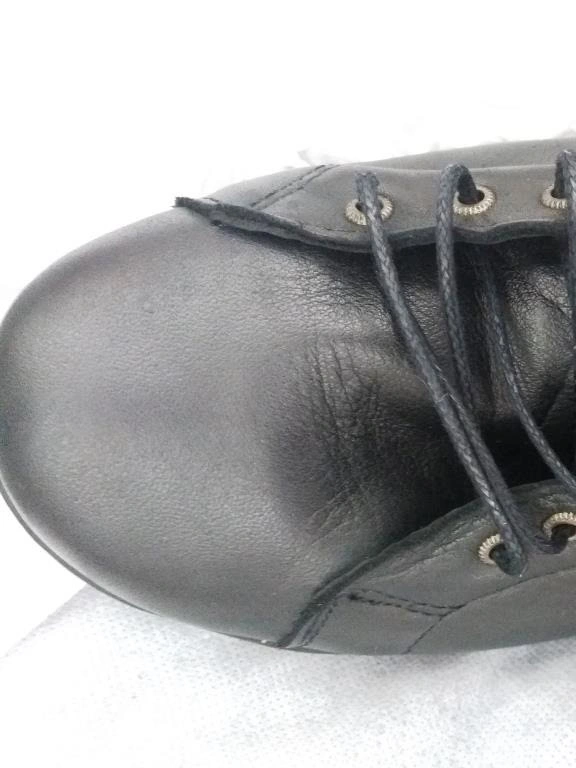 Ботинки отвратительного качества - кривые, прошиты, прострочены неровно, шнуровка перекошена, хорошо видно на фото. Сзади пристрочено криво, впереди наискосок, как будто одну дырку для шнурков не сделали - ужас просто, такие продавали раньше на китайском рынке.