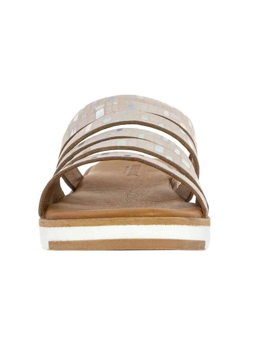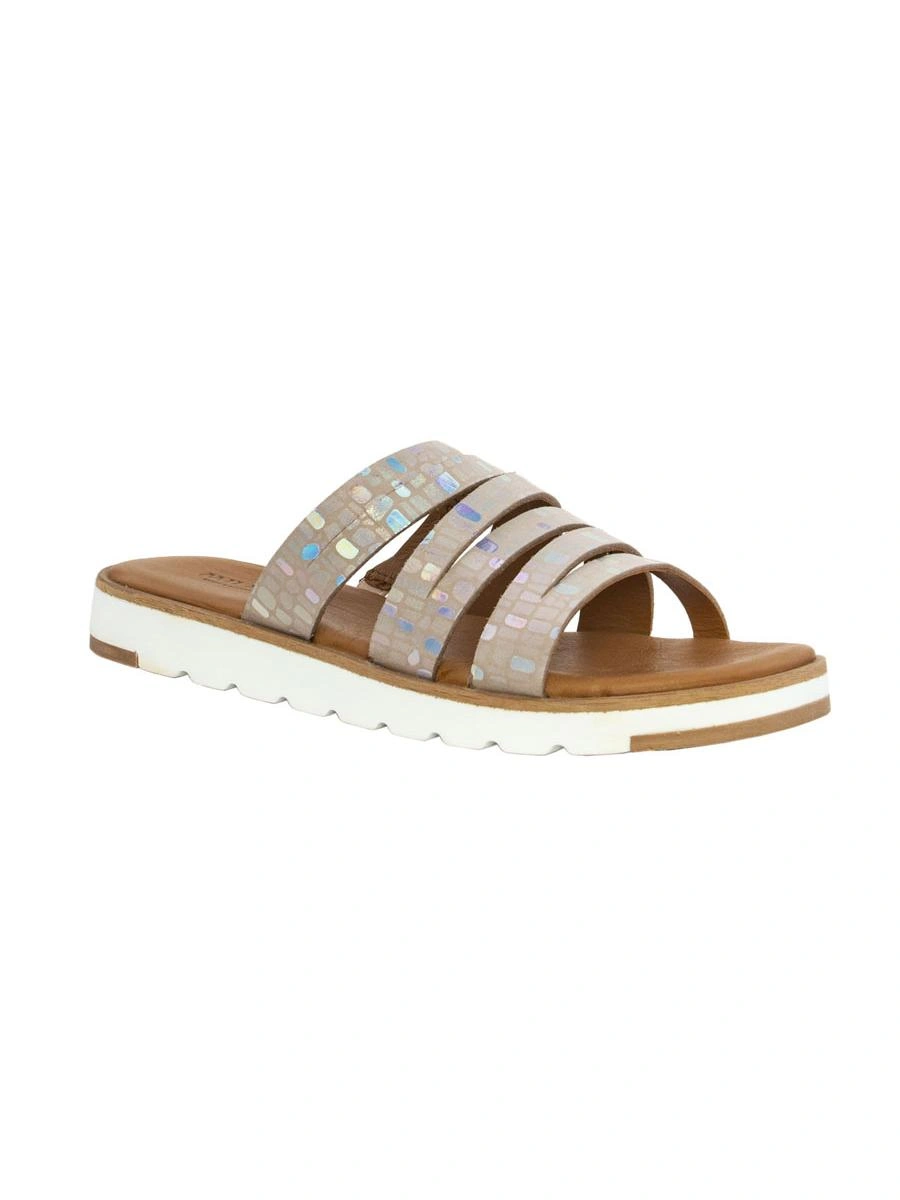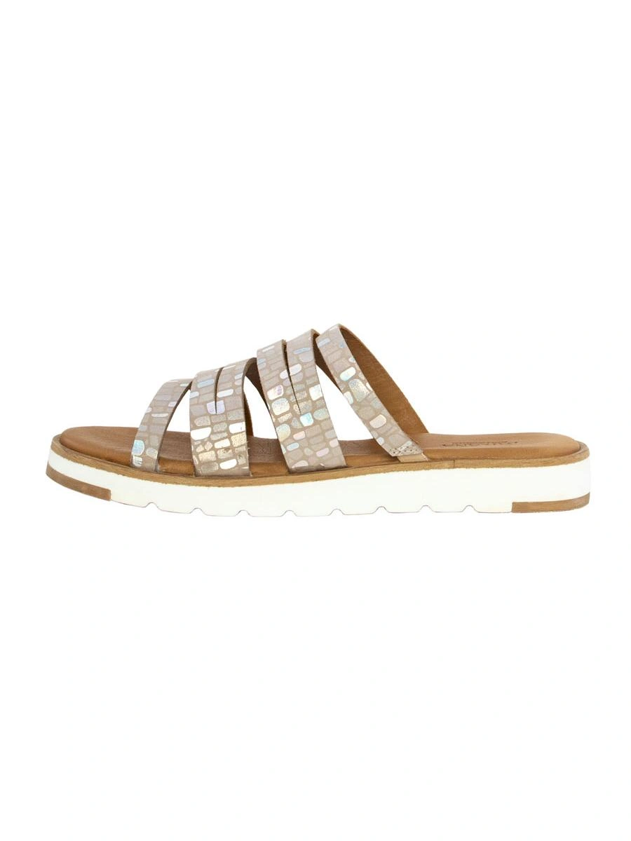 Очень удобные шлепки, стелька мягкая, подошва толстая, с таким рифлением не должна скользить на песке. Блеск умеренный. На мой взгляд визуально стройнят не самые изящные лодыжки.