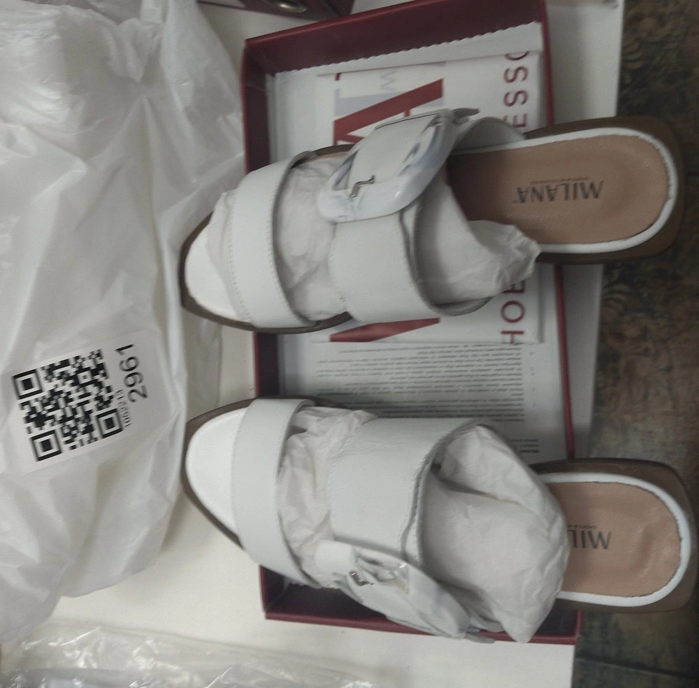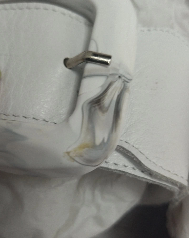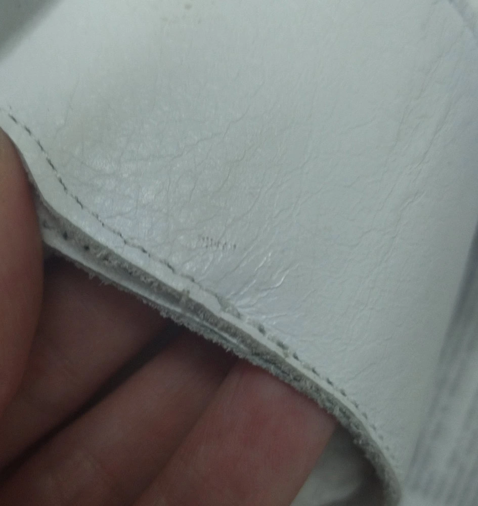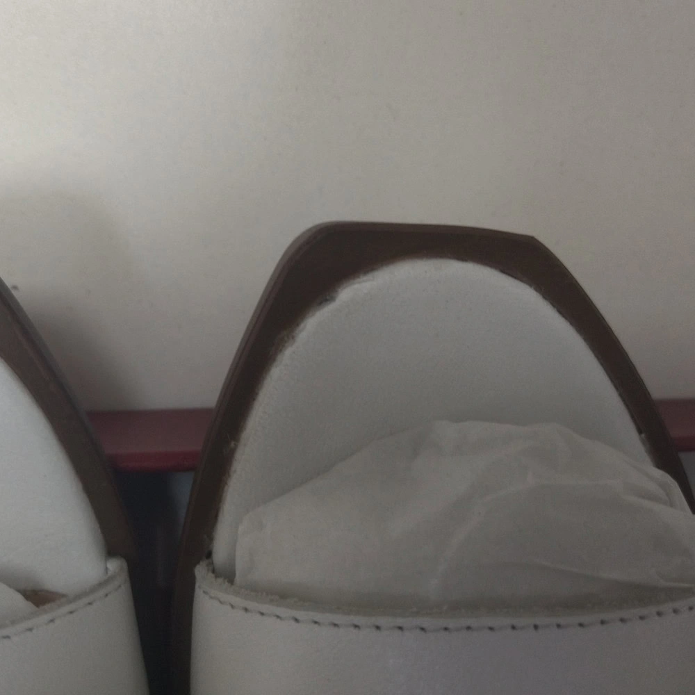 Но эта пара сделана топорно. Клей на пряжке, мелкие царапины на коже, неаккуратная мысочная часть на правом сабо (неровный край и торчащий клей).