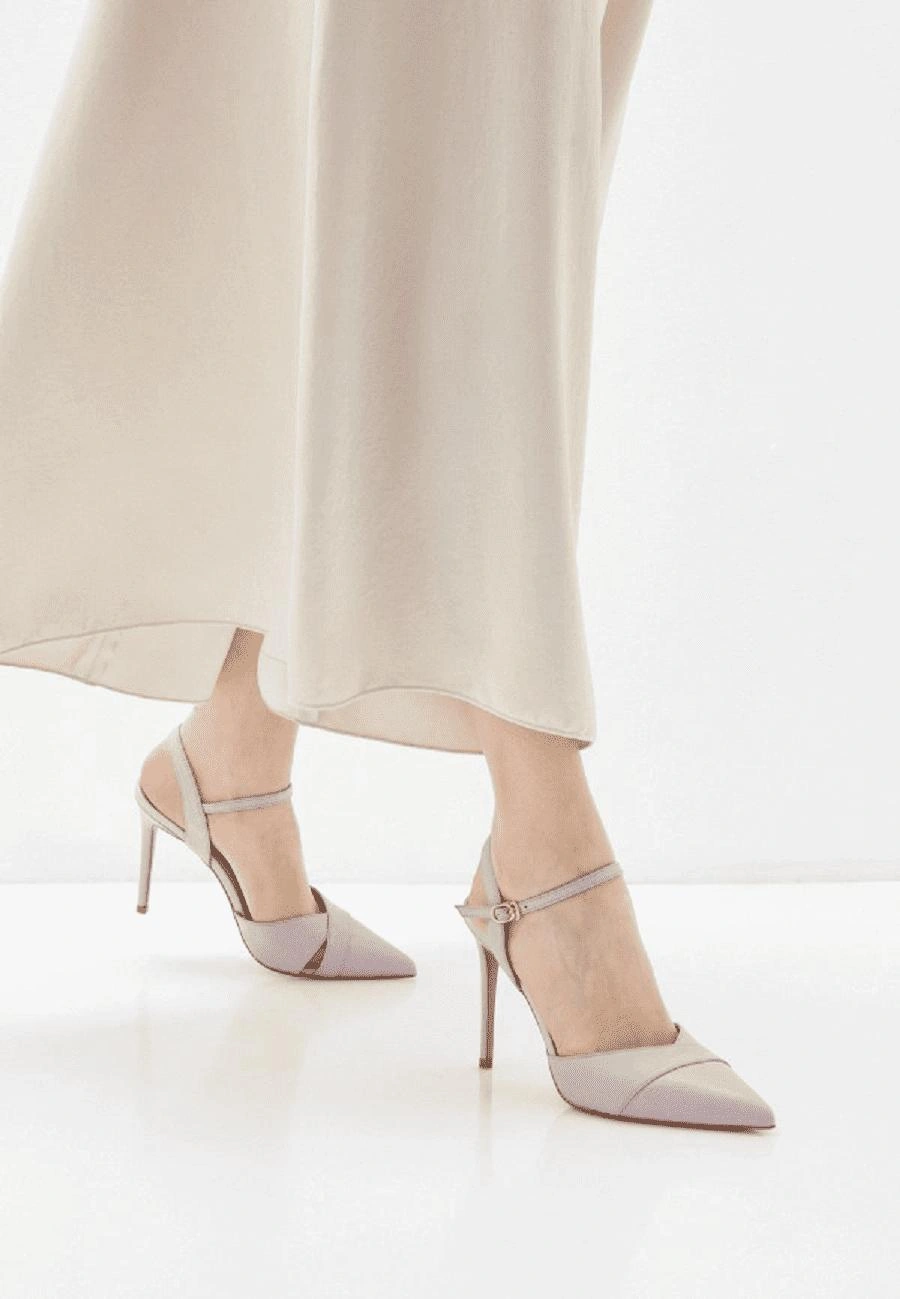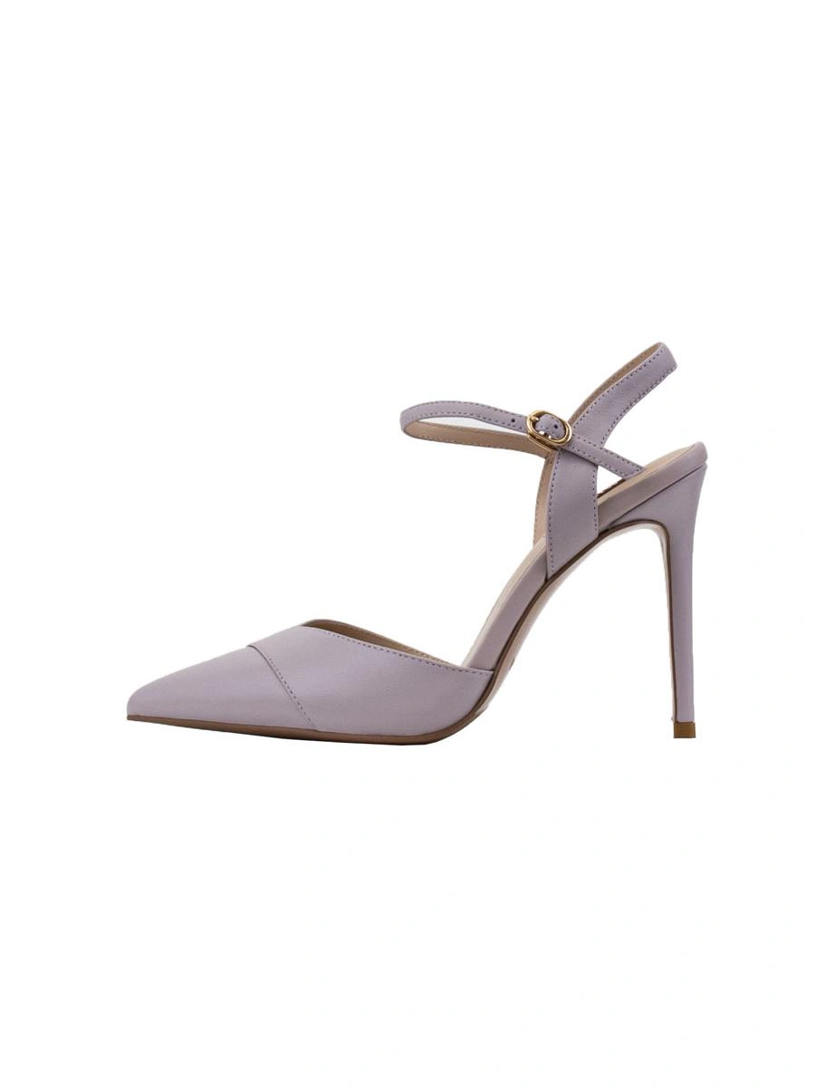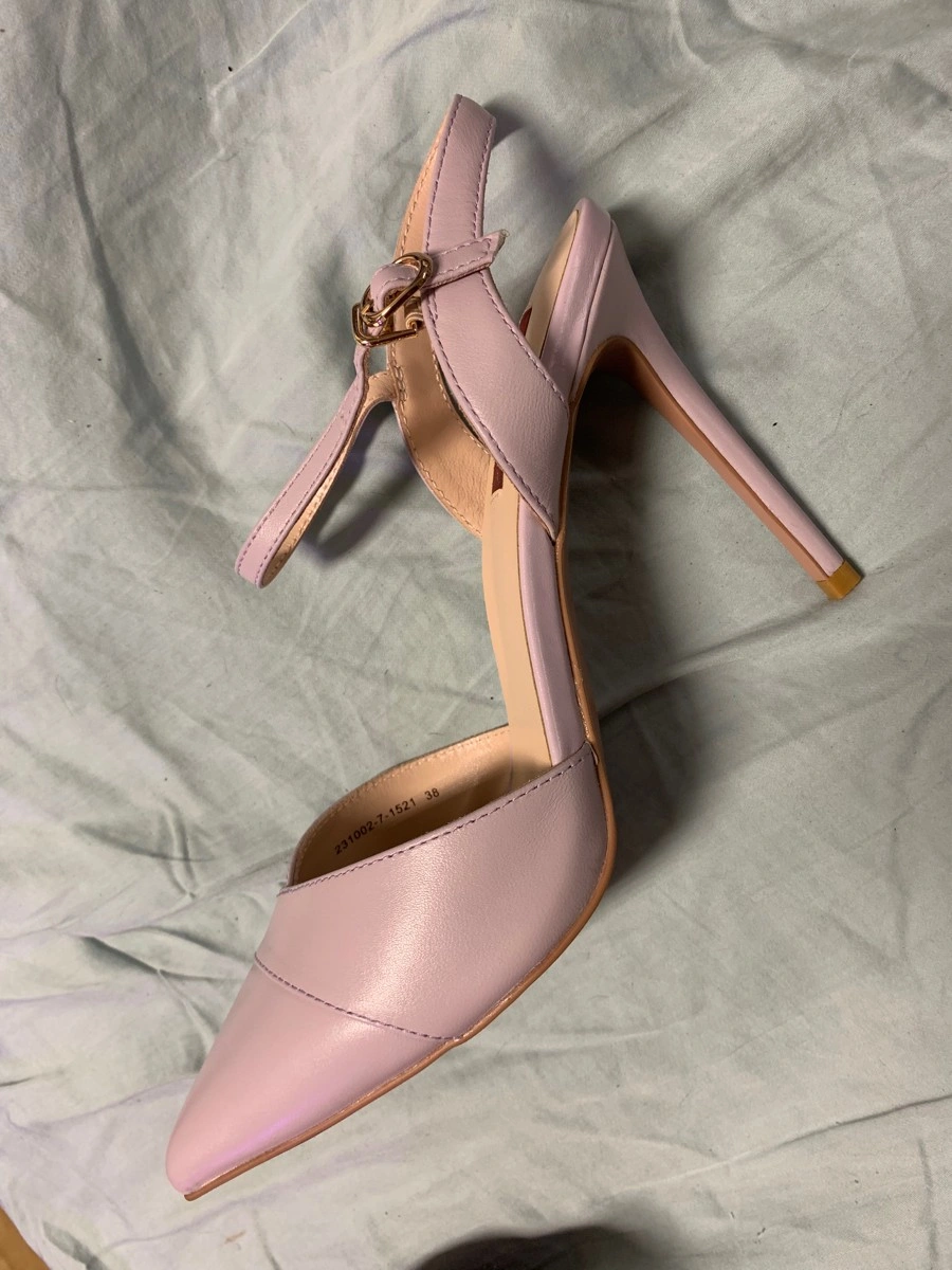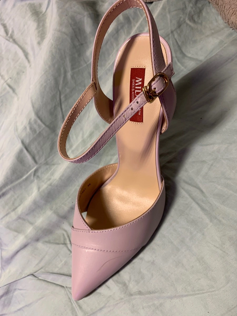 Туфли 36 размера немного маломерит, но ввиду отсутствия задника это неудобств не доставляет, в носовой части не жмут. Цвет серо-сиреневый. Выглядят красиво.
