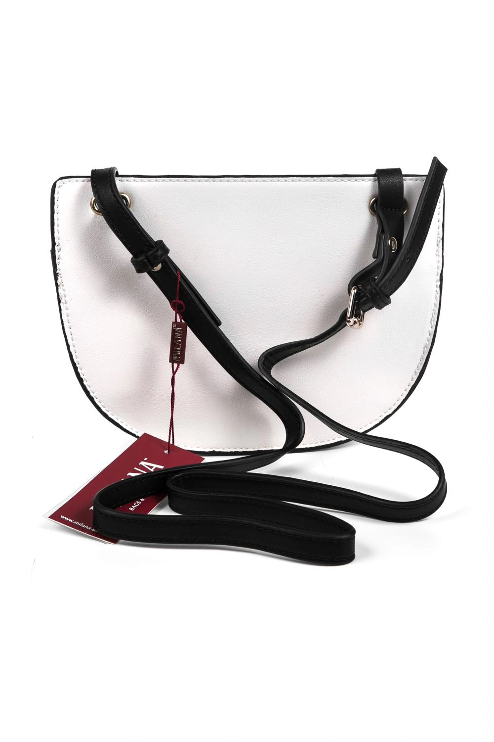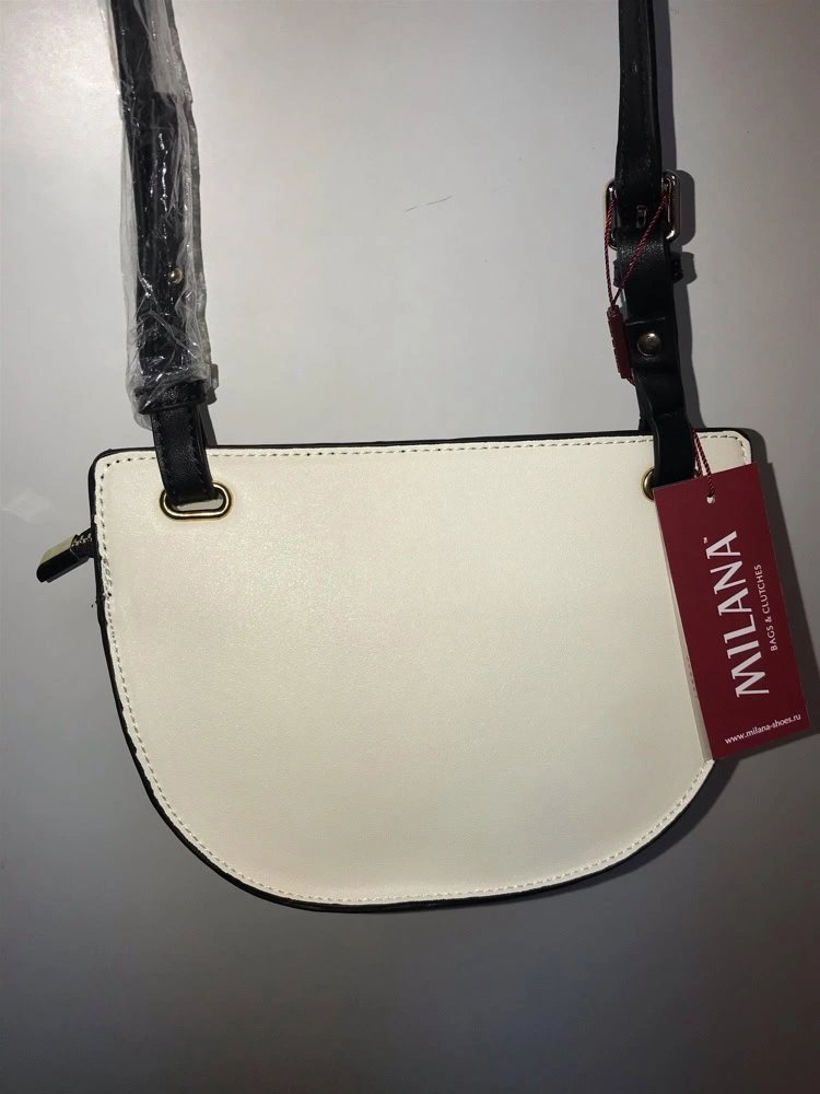Сумка суперская. Маленькая. Имеет два отделения- одно побольше на молнии и с клапаном на магните, второе поменьше -просто с клапаном на магните. Единственное- в описании указан белый цвет, а на самом деле цвет какой-то бело-кремовый или белый с бежевым подтоном. Ремень не очень длинный, носить только на плече. Все равно очень понравилась, взяла.