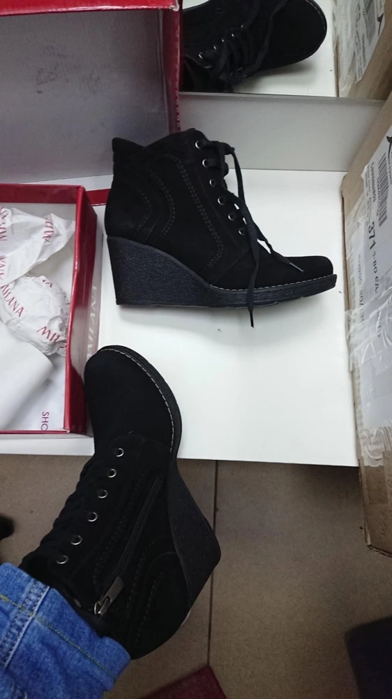 Идут размер в размер. Цвет хороший чёрный, полное соответствие картинке. Внутри утеплённые. Колодка удобная. Всё вобщем то отлично, но меня немного смущает фактура танкетки, дешевит она немного. И мысок чуть задран кверху. Оставила, посмотрю, как будут сочетаться с джинсами и курткой, под которые планирую носить.Ставлю 5. Т.к. по качеству претензий нет и размер соответствует.