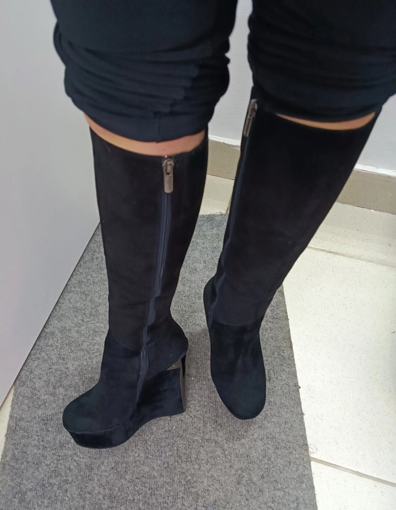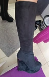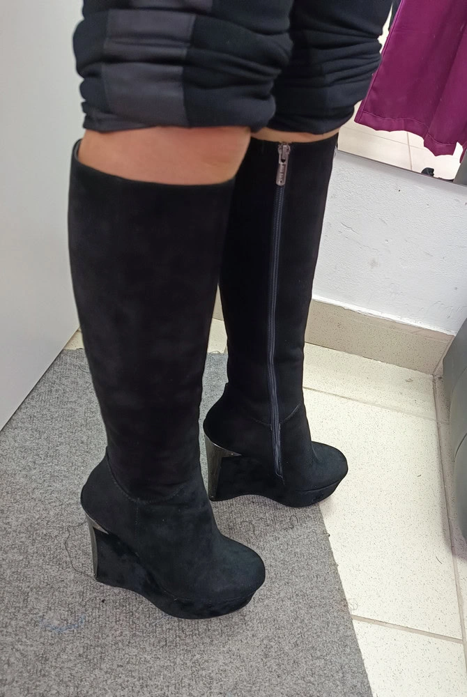 Сапоги красивые, мех,не поняла так и натуральный или искусственный , идёт от стопы и выше щиколотки. Далее идёт искусств.короткий ворс. Танкетка обтянута имитацией велюра,это заметно,так как цвет ярче,чем у сапога. Сами сапожки аккуратные,по ноге,но мне на р.36 показались слишком узкие в стопе,прям впритык, колготки теплые туда уже не наденешь. Голенище легко застегнулось. Взяла бы,если появится, р.37. Подошва на зиму не пойдет, будет сколько, необходимо будет делать профилактику - подклеивать что-то нескользящее, так как протектора на подошве практически нет. Но на холодную осень,до гололёда,сапоги подойдут.